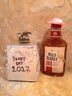 Earlier in the day, I had gotten my arts n crafts on and created some prizes for the person with the winning horse and for best hat (the trophy box wrapped in tinfoil contained a stainless steel Churchill Downs julep cup) The numbers 1 through 20 were distributed to the first 20 people who showed and that was their corresponding horse in the race. The horses went to post and a few minutes later it was all over. In the end, it was the #19 horse, I'll Have Another (10:1 odds), that crossed the finish line first and won the Kentucky Derby. It was the first time in Derby history that a horse starting from the #19 post won the race.